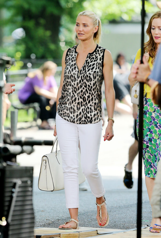 | Cameron Diaz giản dị, nhưng vẫn năng động khi kết hợp khéo léo quần jeans trắng với áo họa tiết da báo và sandals trẻ trung. |