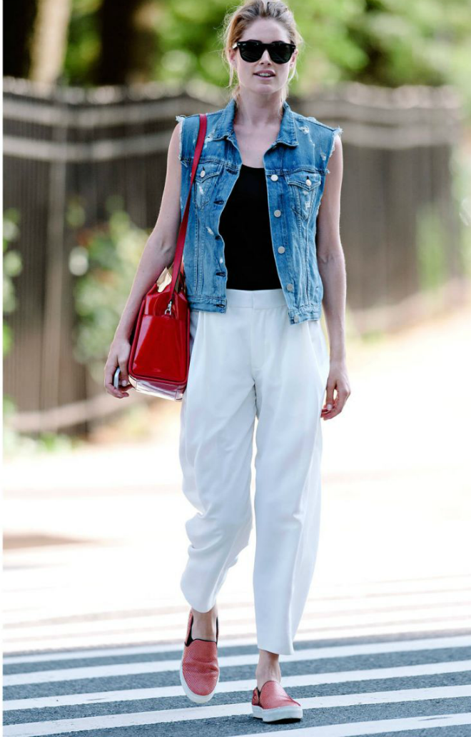 | Thiên thần Doutzen Kroes lại chọn phong cách thể thao với quần ống suông Chloé, áo tank top Rag & Bone và áo khoác không tay denim Acne cực cá tính. |