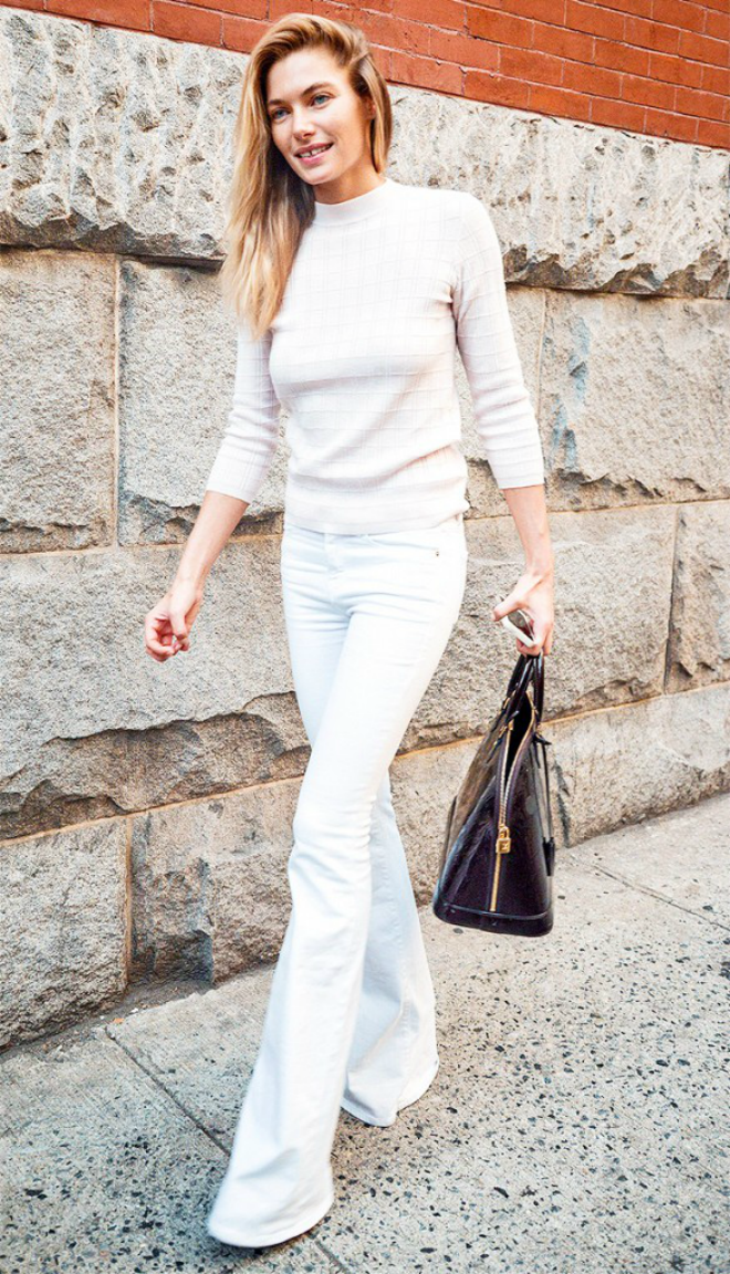 | Nếu bạn may mắn sở hữu đôi chân dài và chiều cao đáng mơ ước, đừng ngần ngại chọn quần jeans trắng ống loe và giày đế xuồng cao. Bạn có thể phối quần jeans trắng với áo len như Jessica Hart. |