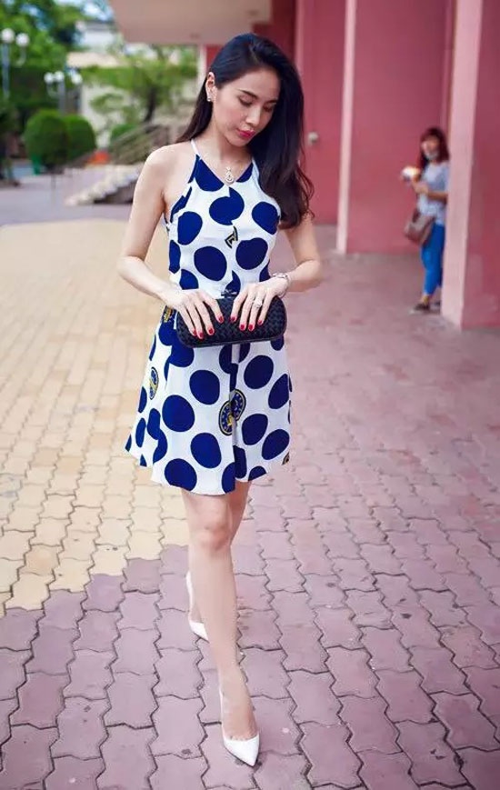 Thời trang váy chấm bi có ưu điểm khiến người mặc dễ tạo ấn tượng ngay từ cái nhìn đầu tiên. Thủy Tiên gợi ý váy chấm bi hai dây kết hợp giày trắng và ví cầm tay như cô đi chơi sẽ tạo nên sự lãng mạn hiếm có.