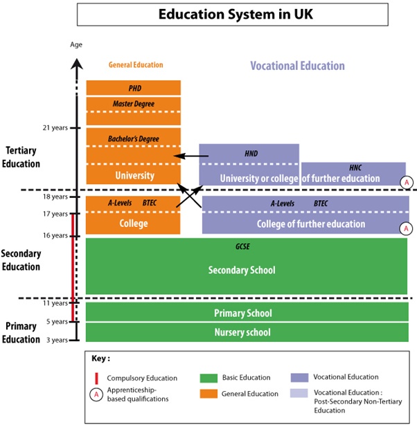 Bậc học phổ thông tại Vương quốc Anh là 11 năm, học sinh bắt đầu đi học từ 5 tuổi (học mẫu giáo từ 3 tuổi).