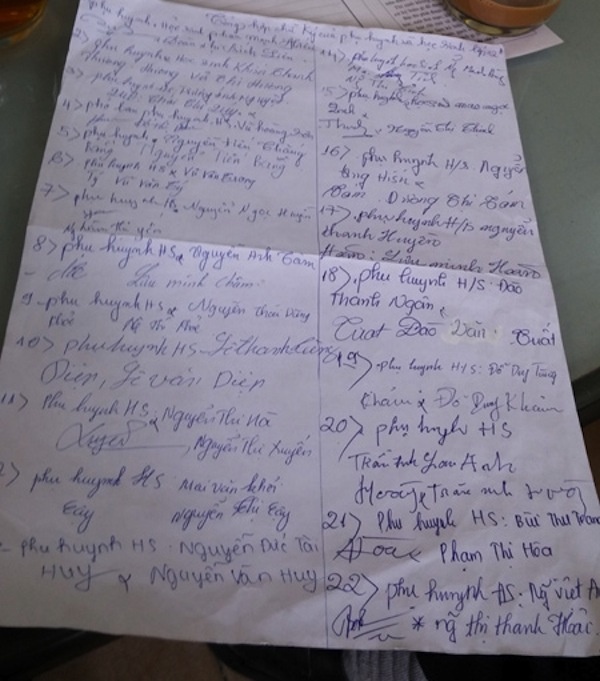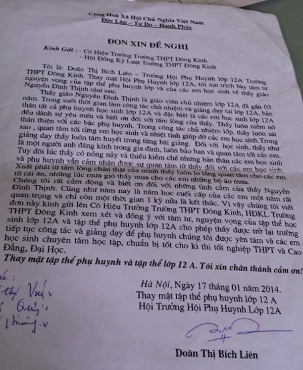 Liên quan đến sự việc, ngày 17/1, đơn với chữ ký của 22 phụ huynh lớp 12A đã được gửi đến hiệu trưởng Tâm cùng hội đồng kỷ luật trường THPT DL Đông Kinh.