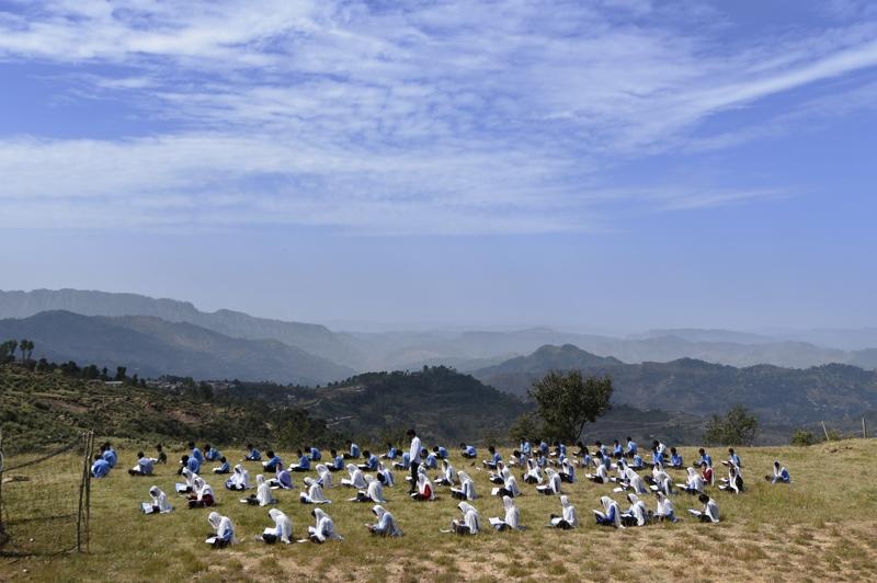 Học sinh trường Pinewood làm bài thi diễn ra tại khoảng đất trống trên đồi ở thị trấn Hamirpur. Ảnh: HT. |