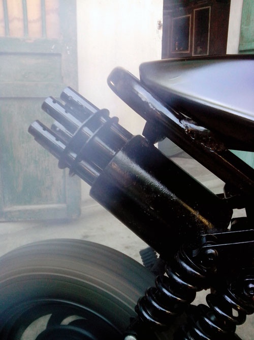 Phuộc trước của xe tự chế tạo, phuộc sau lò xo được lấy từ xe địa hình. Bình xăng tự chế dung tích 2,5 lít. Hệ thống phanh xe không sử dụng phanh chân, mà chuyển sang phanh tay, loại phanh đùm.