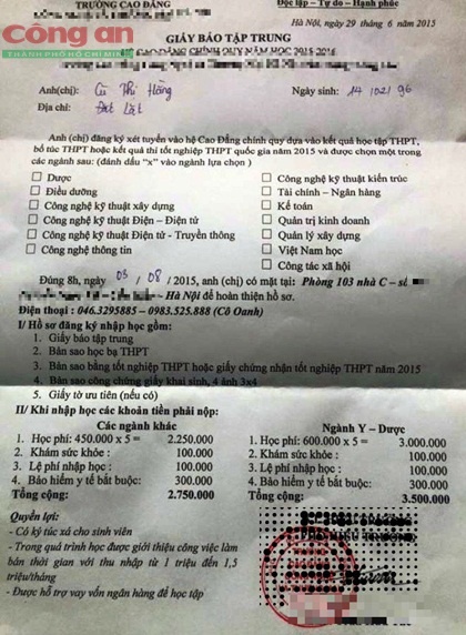 | Giấy báo nhập học của trường em Hằng không hề đăng ký. Ảnh: Công An TP HCM. |