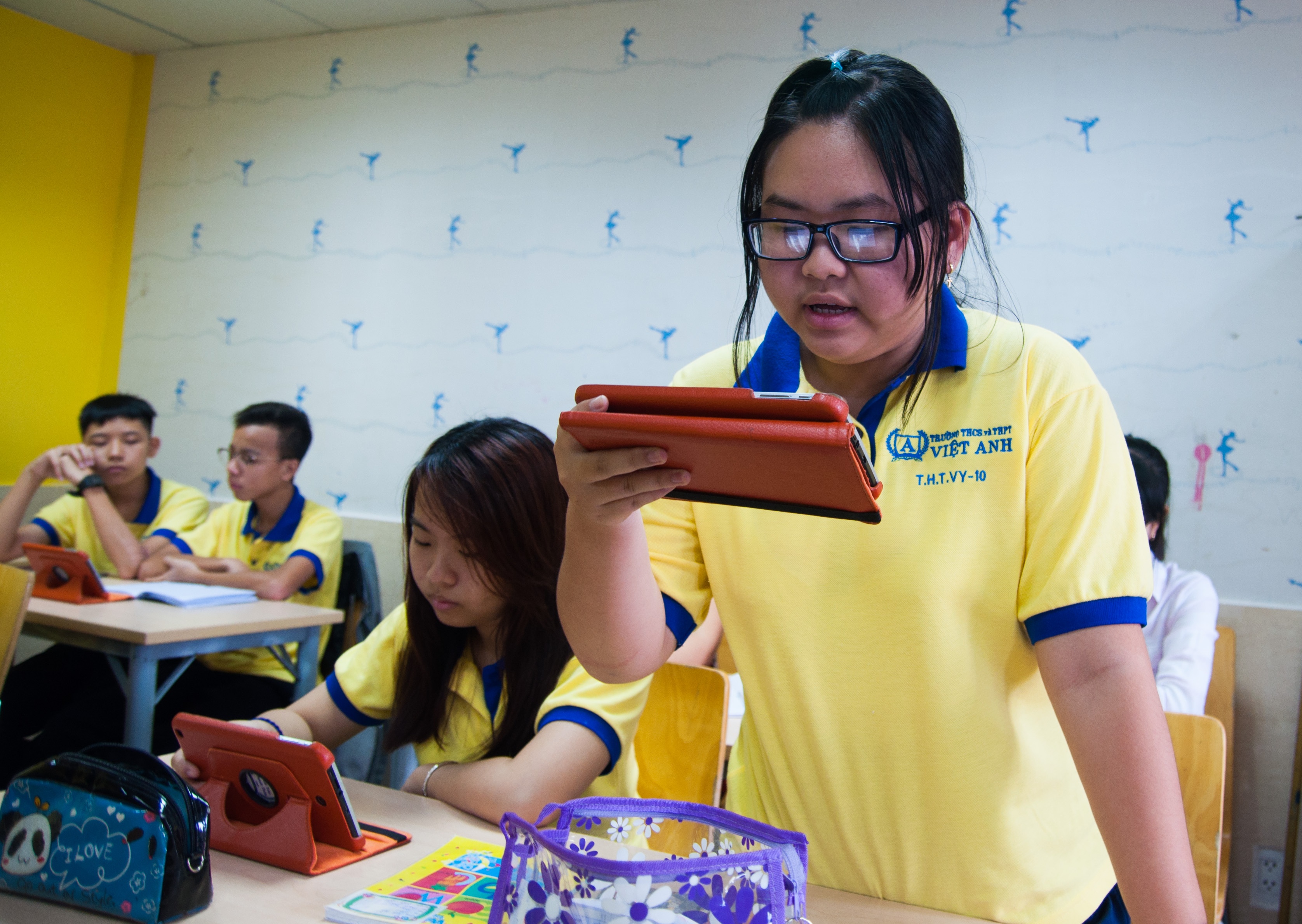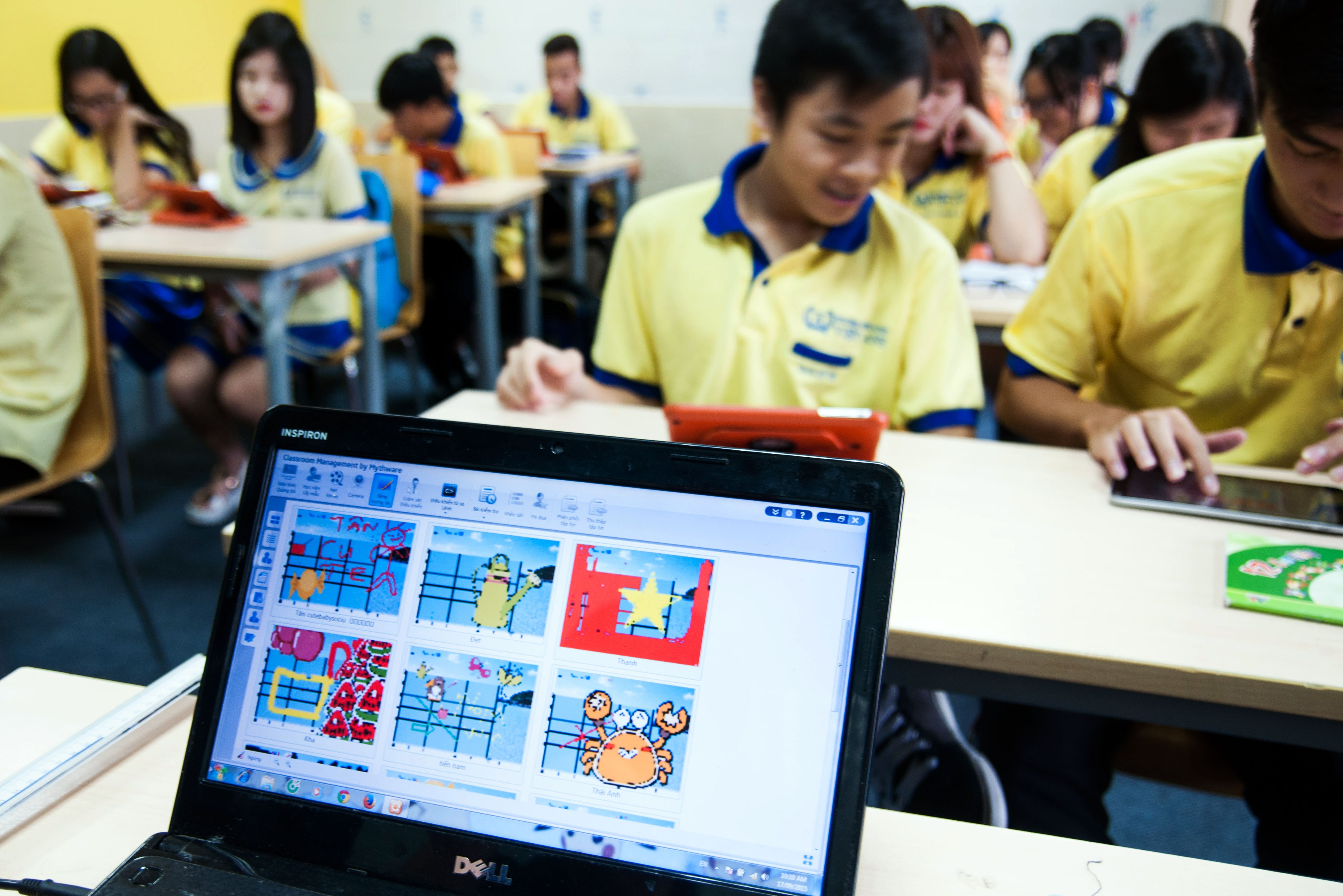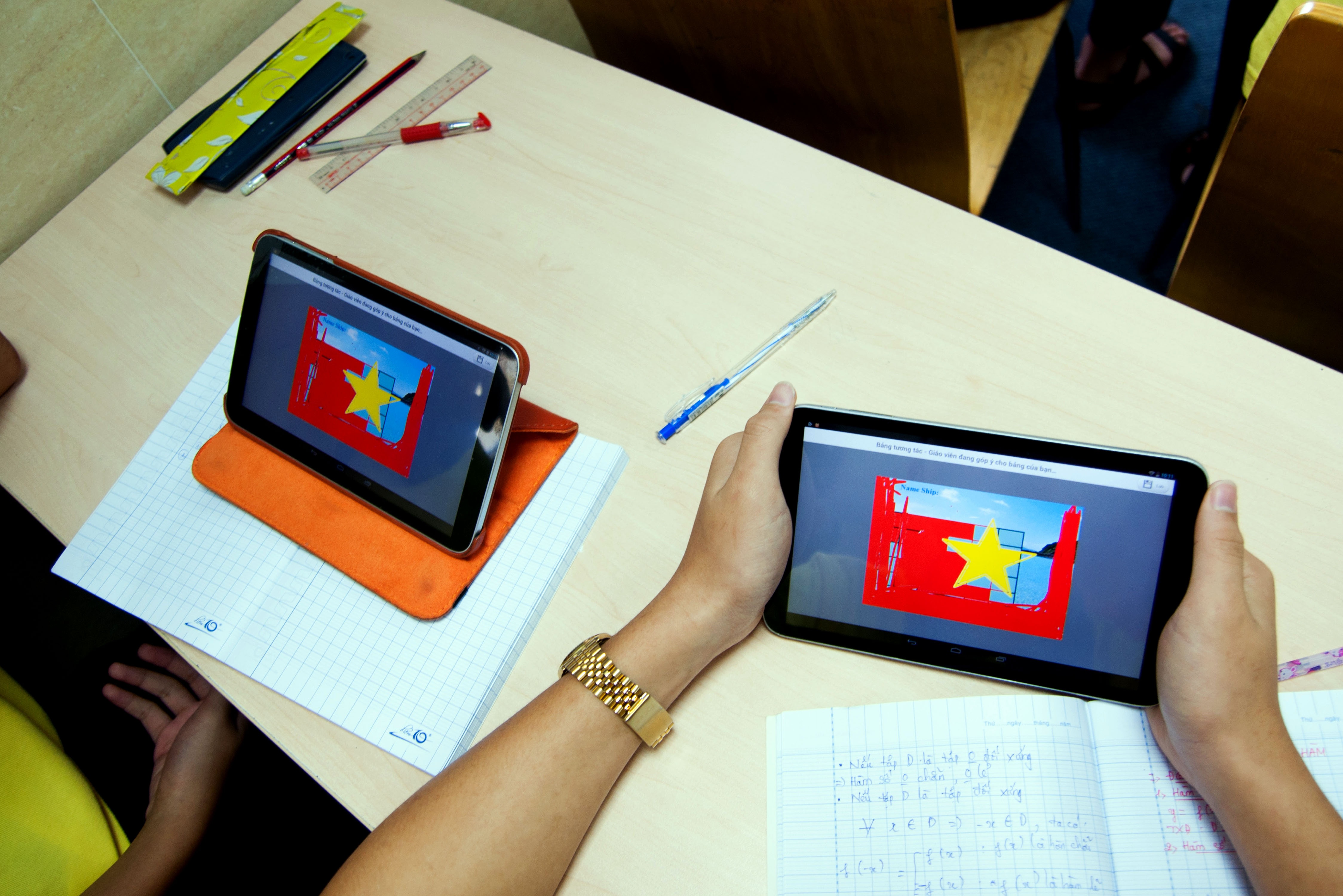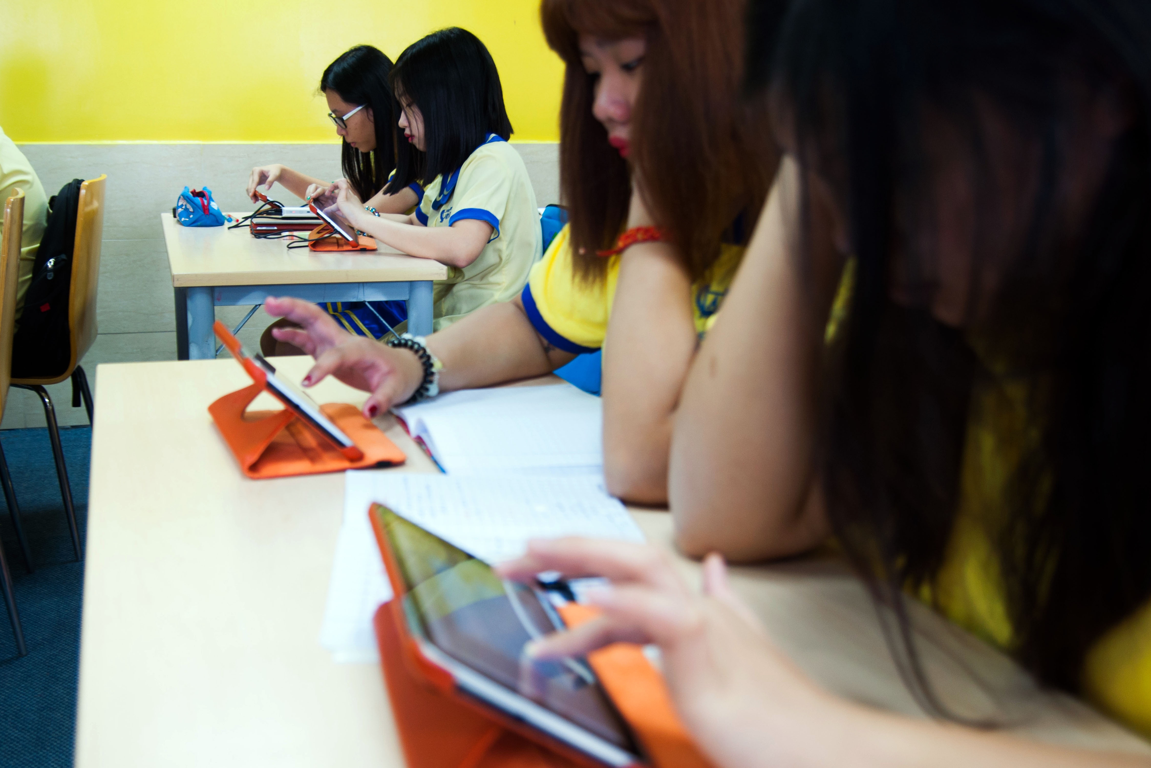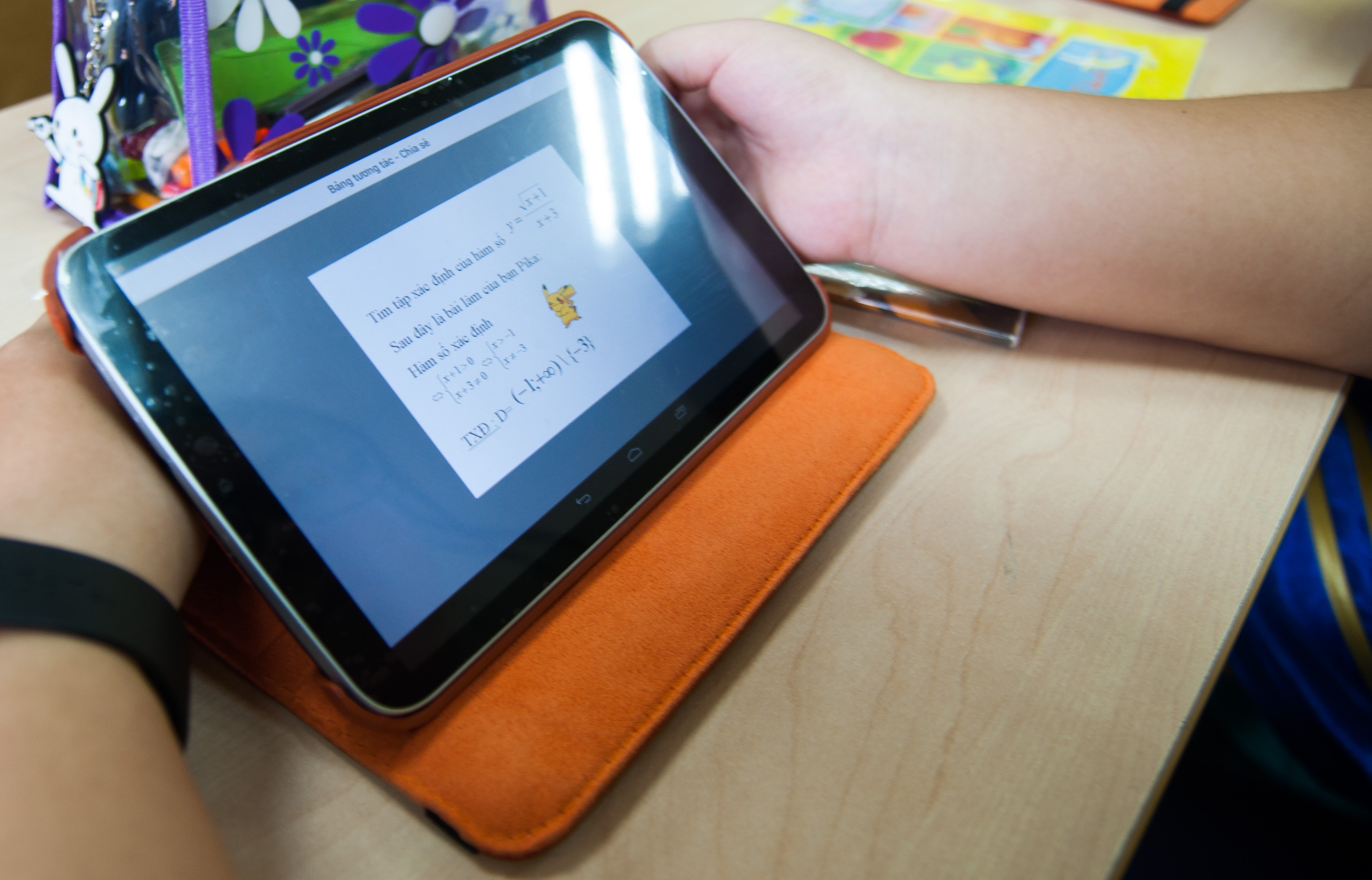 Học sinh Sài Gòn dùng máy tính bảng học bài trong lớp