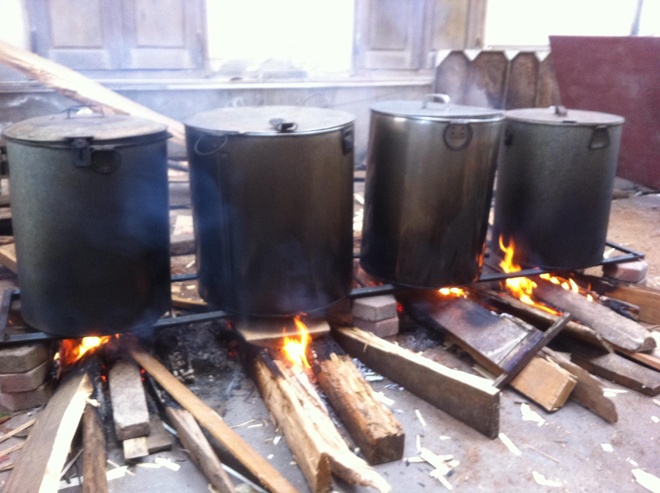 Thầy và trò cùng nhau hoàn thành nồi bánh chưng đón Tết.