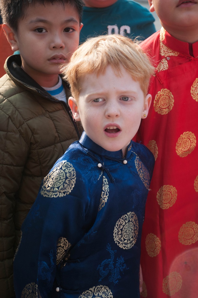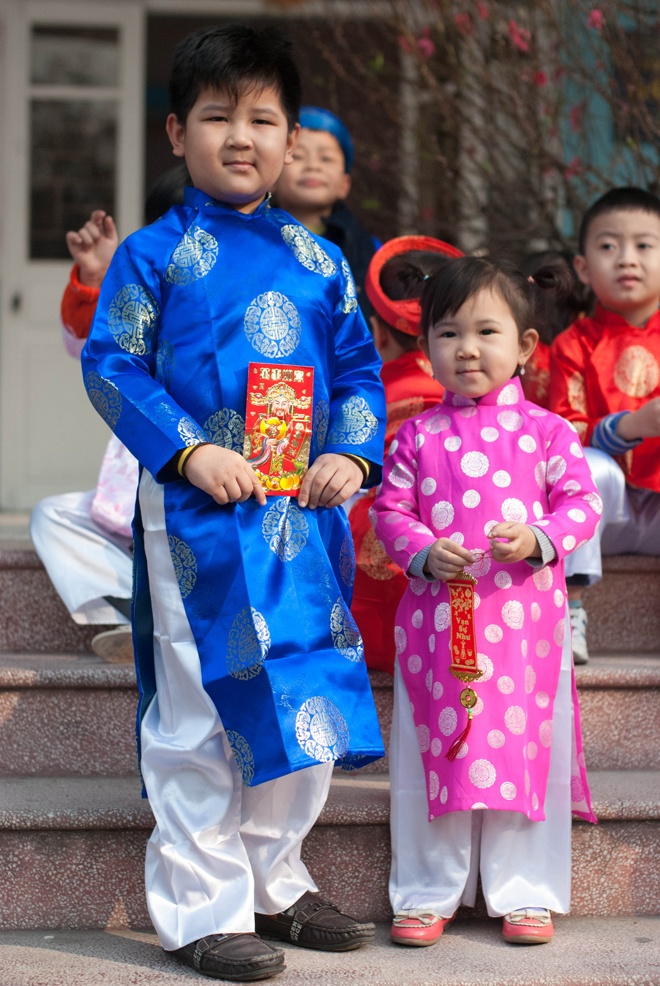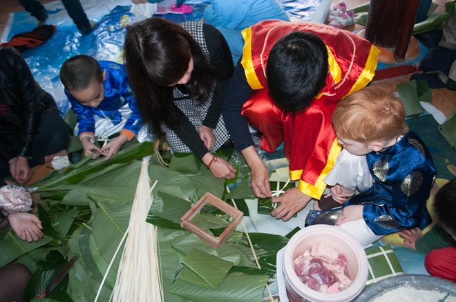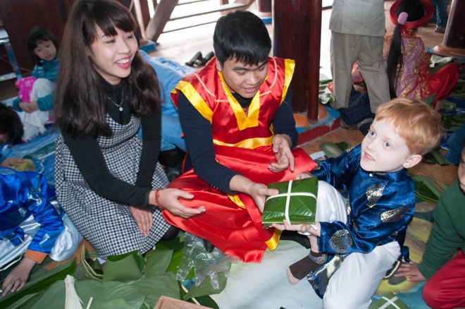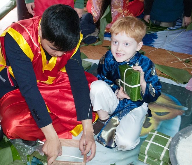| Ngày 23/1, Bodhi - một trong số ít học sinh nước ngoài của trường Hà Nội VIP - cũng diện áo dài truyền thống tham dự ngày hội Gói bánh chưng đón Tết. |