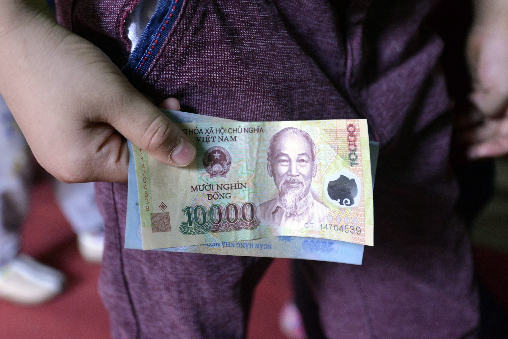 | Một em nhỏ mang theo tiền công đức để lấy chữ. |
