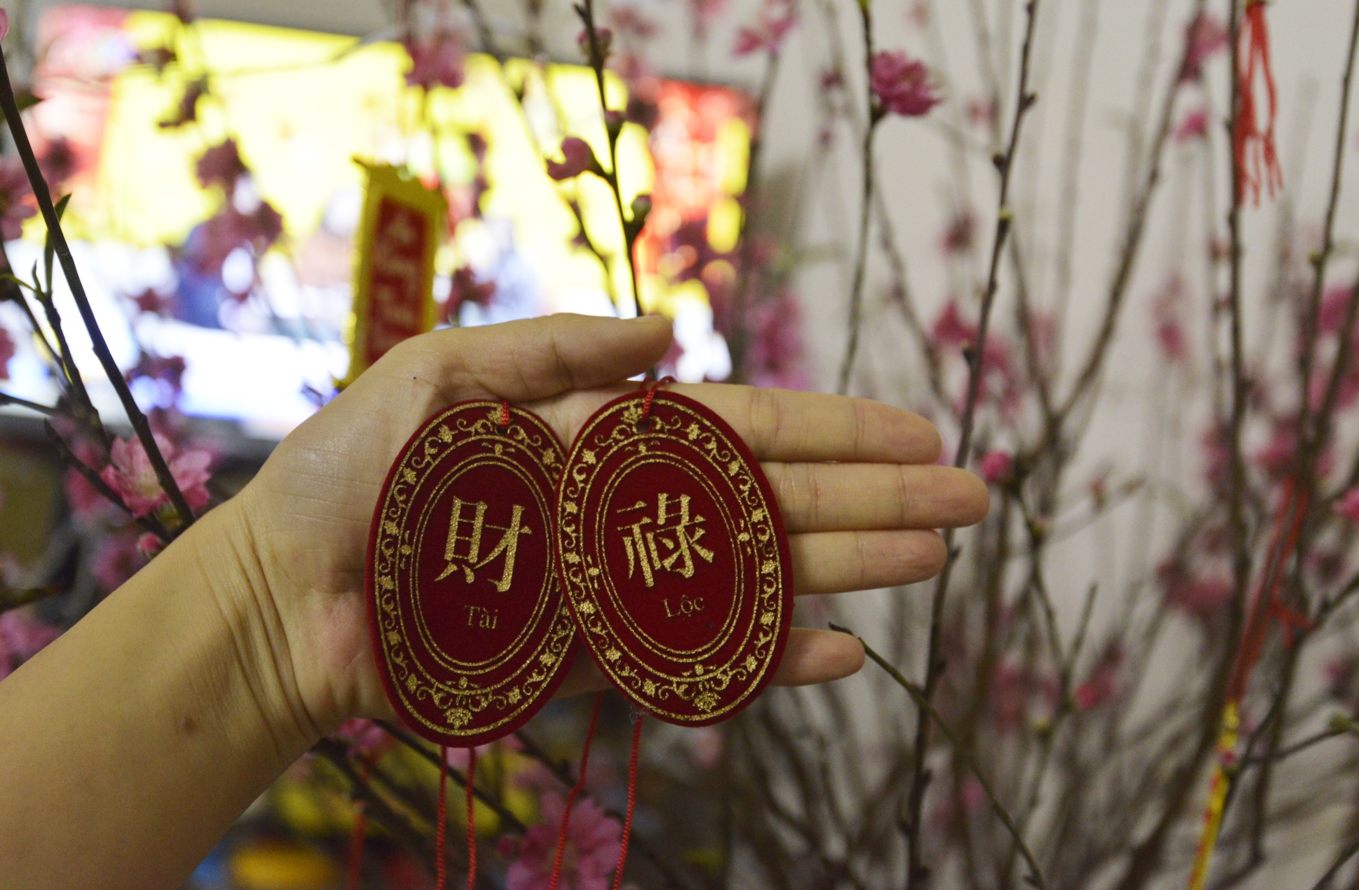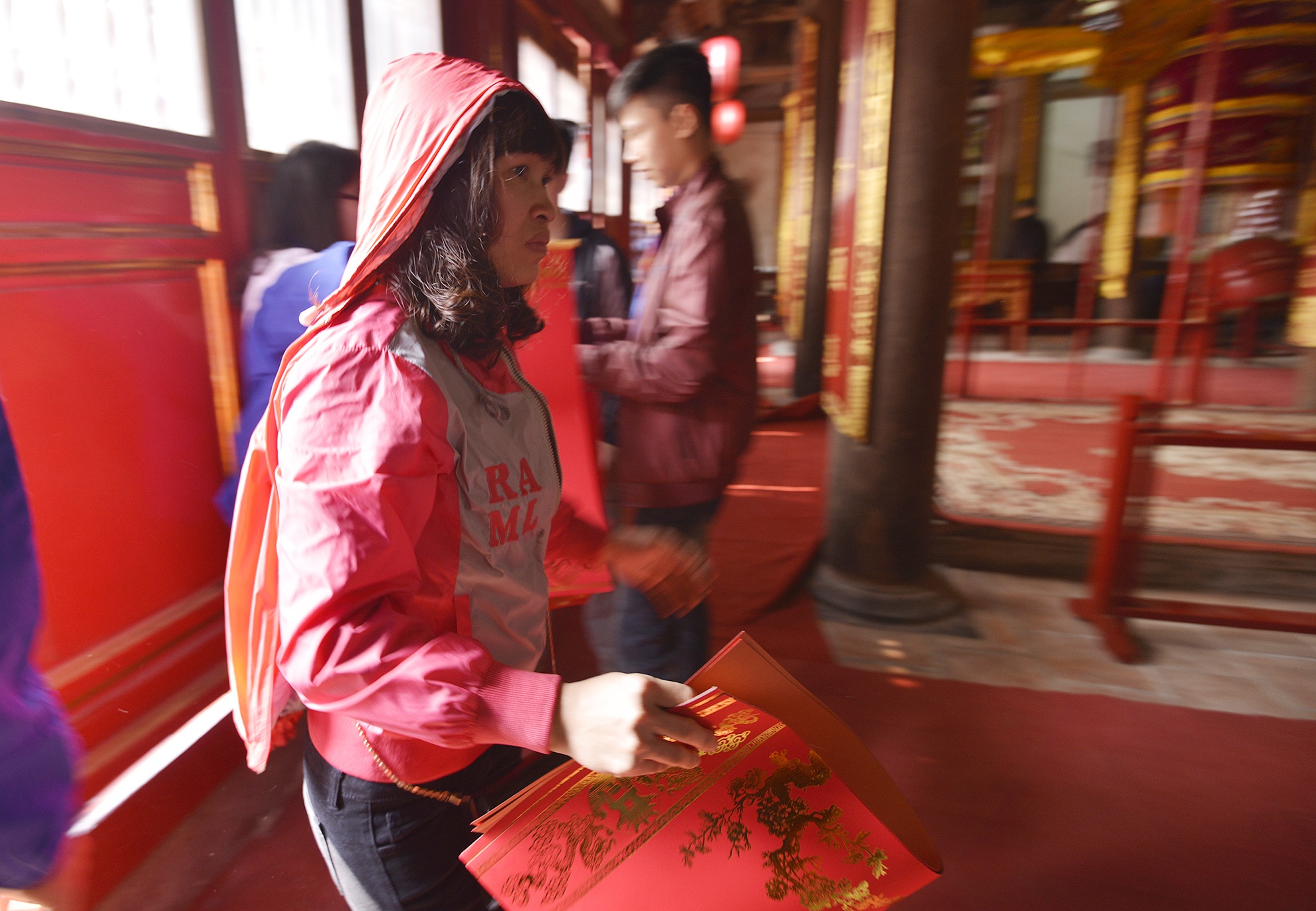 | Bên trong ban thờ, tấp nập người vào làm lễ và xin chữ. Chữ có hình dáng như những chiếc khánh, có màu đỏ và dây đeo. |