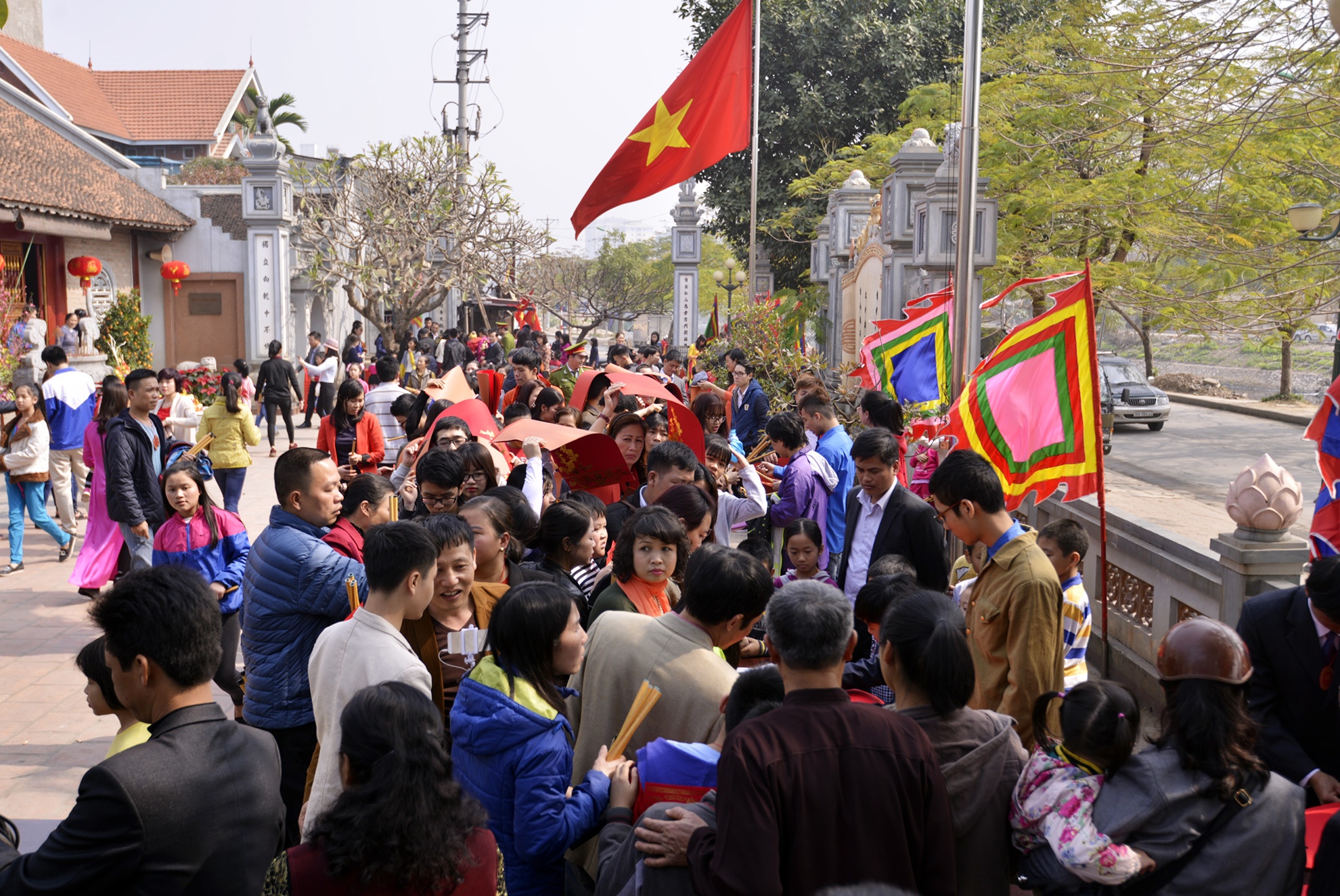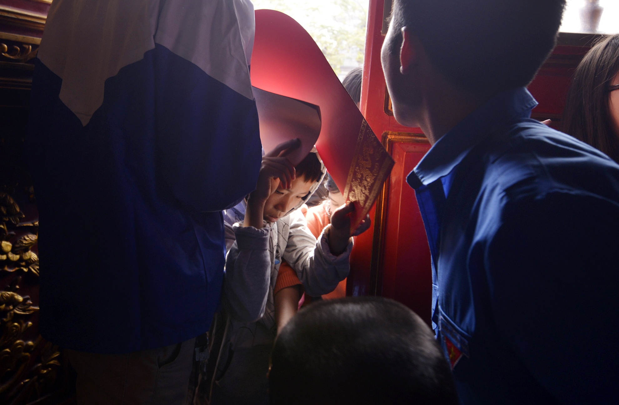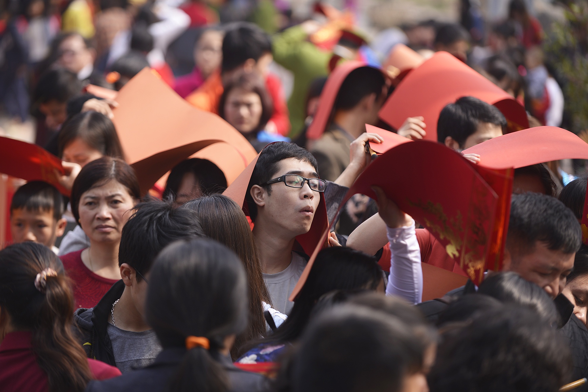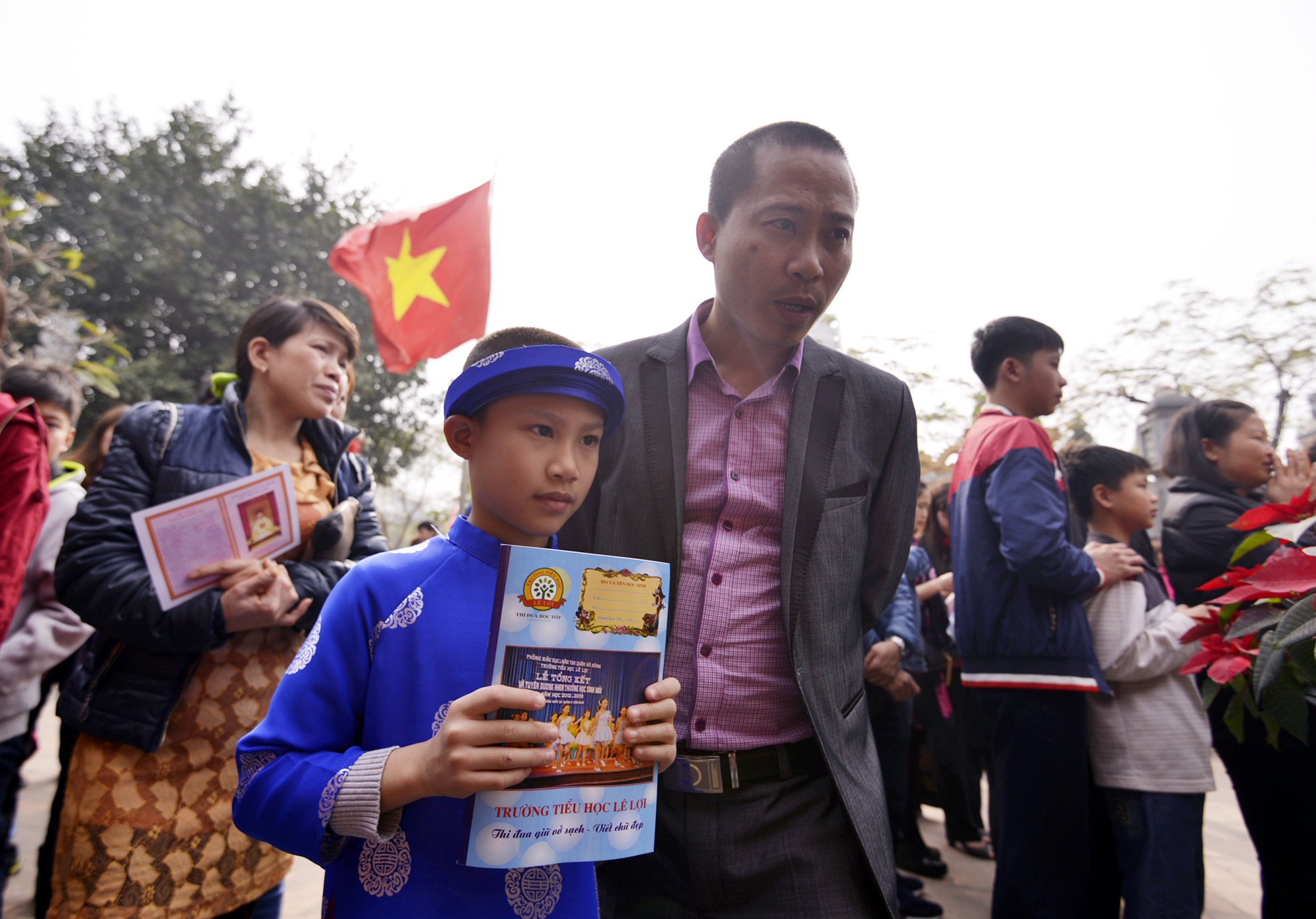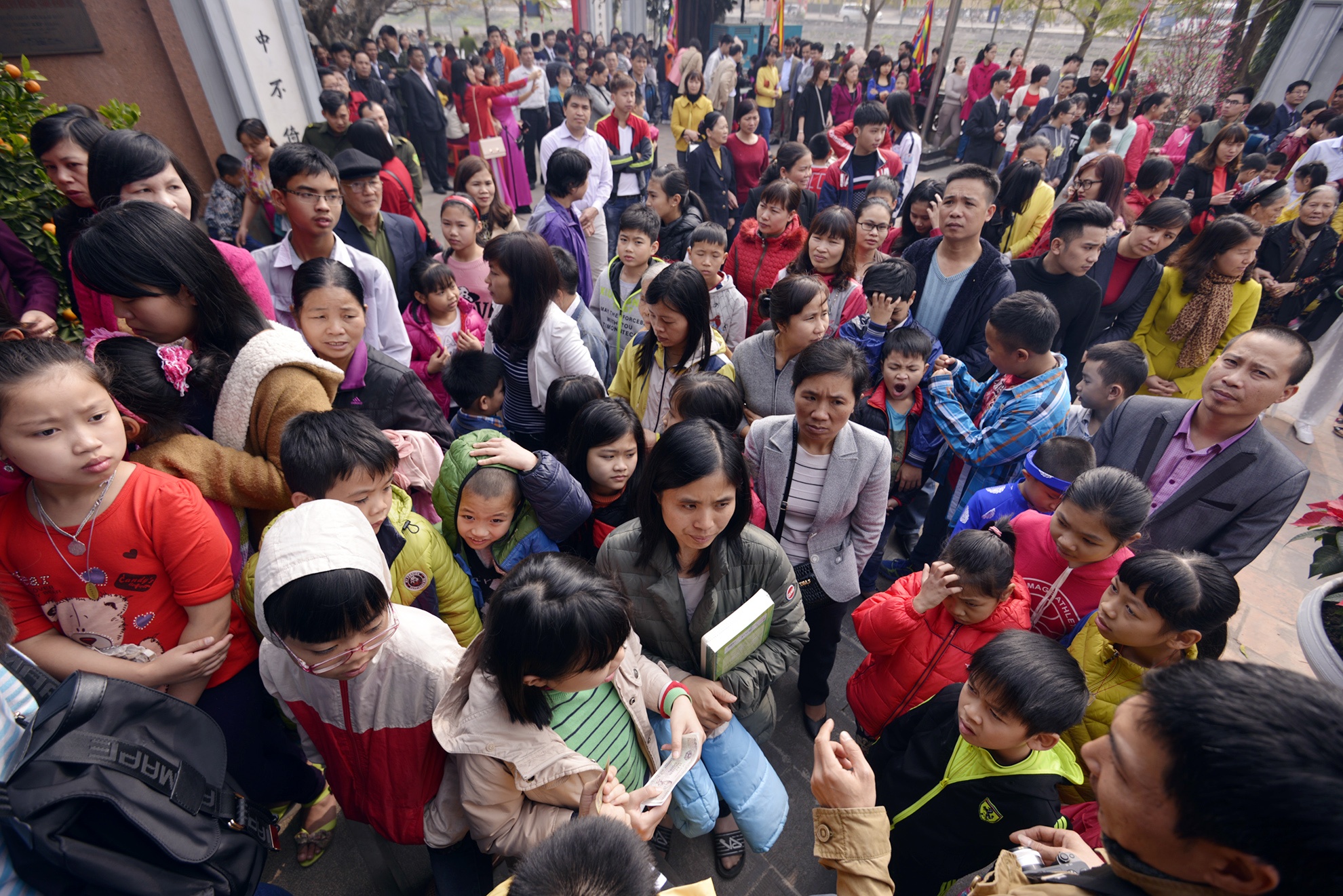 Lượng người tham dự khá đông nhưng xếp hàng trật tự. Ai cũng tin tưởng việc xin được chữ trong ban thờ Chu Văn An sẽ gặp nhiều may mắn trong học tập.