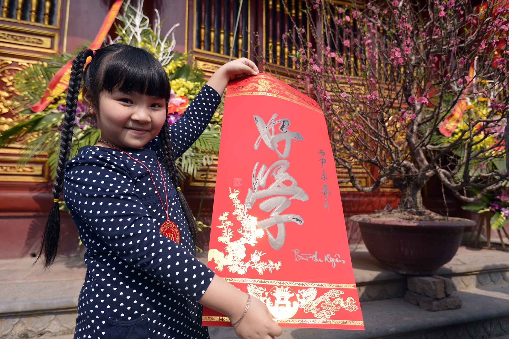 | Em Bùi Thu Ngân khoe chữ Học mới xin được từ ông đồ. Mẹ bé cho biết, năm nay, gia đình về quê ngoại ăn Tết nên tranh thủ lên đình xin chữ và khai bút. |