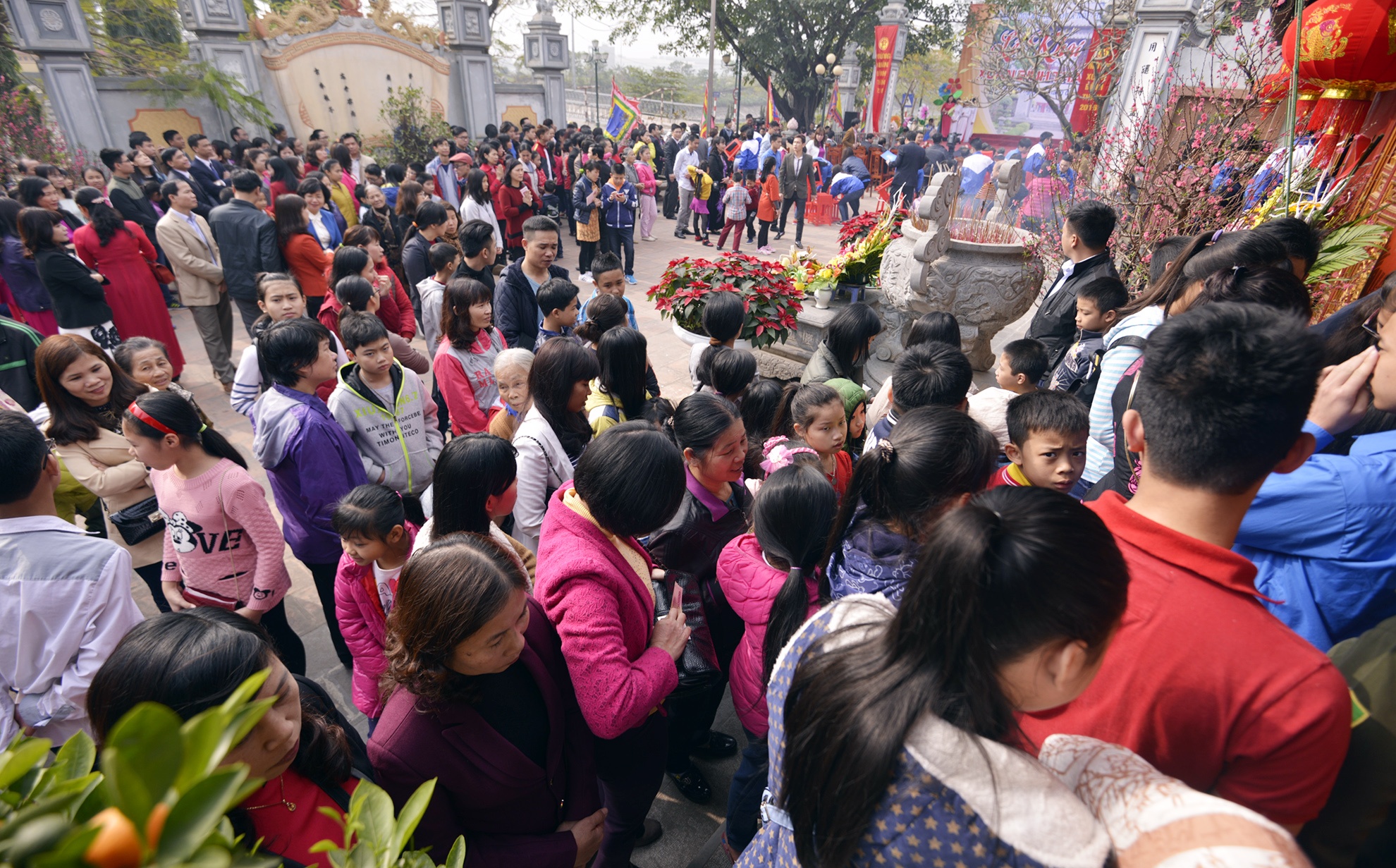 ngoài sân đình thờ Tiên triết Chu Văn An, rất đông người lớn và trẻ em xếp hàng, chờ sẵn để chuẩn bị vào thắp hương và dâng sách vở.