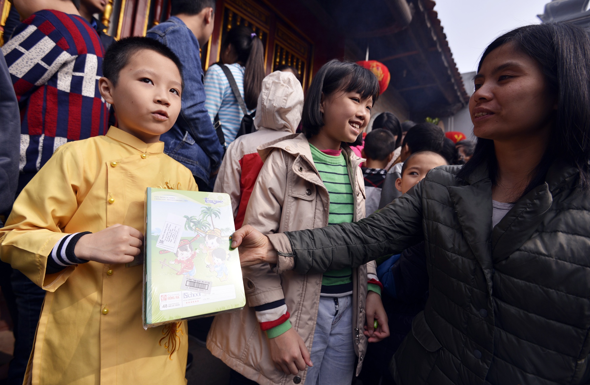 | Bé Lê Đức Minh (áo vàng) học lớp 3, Trường tiểu học Thịnh Liệt cùng mẹ và chị gái đền đình Chu Văn An khai bút, cầu mong sức khỏe và năm mới học hành tấn tới. |