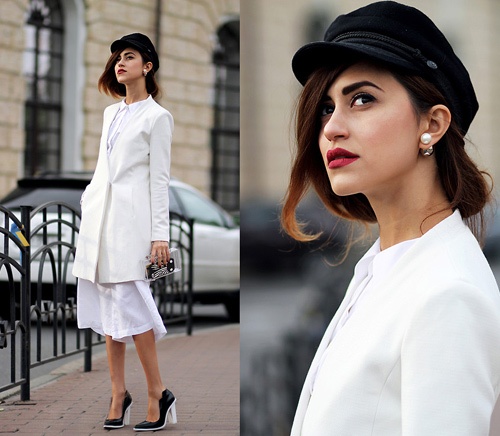 Phong cách cổ điển vô cùng quyến rũ với áo choàng trắng và váy midi đồng màu.