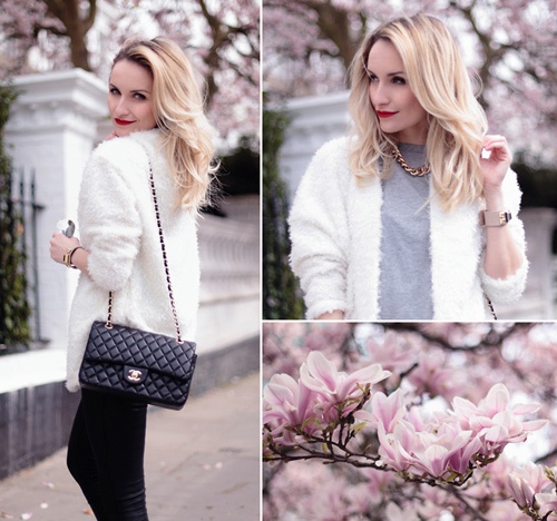 | Áo choàng trắng mix rất ăn ý với tông nude nhẹ nhàng. |