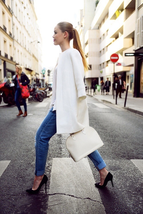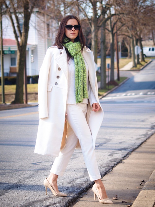 | Áo choàng trắng mix kèm sơ mi và quần skinny cho những vùng thời tiết không quá lạnh. |