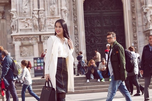 | Hà Anh thanh lịch khoe dáng trong chiếc áo da trắng cổ điển. Ảnh: Kênh 14 |