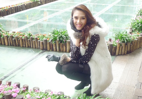 | Hoàng Yến trẻ trung với chiếc áo khoác lông dáng gilê trắng muốt. Ảnh: Eva |