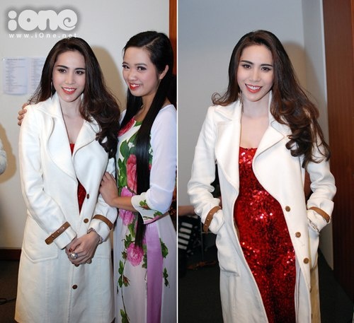 Kết hợp cùng trang phục biểu diễn đỏ rực, Thủy Tiên chọn chiếc áo khoác trắng dài với chất liệu dạ rất thanh lịch, nữ tính. Ảnh: Ione