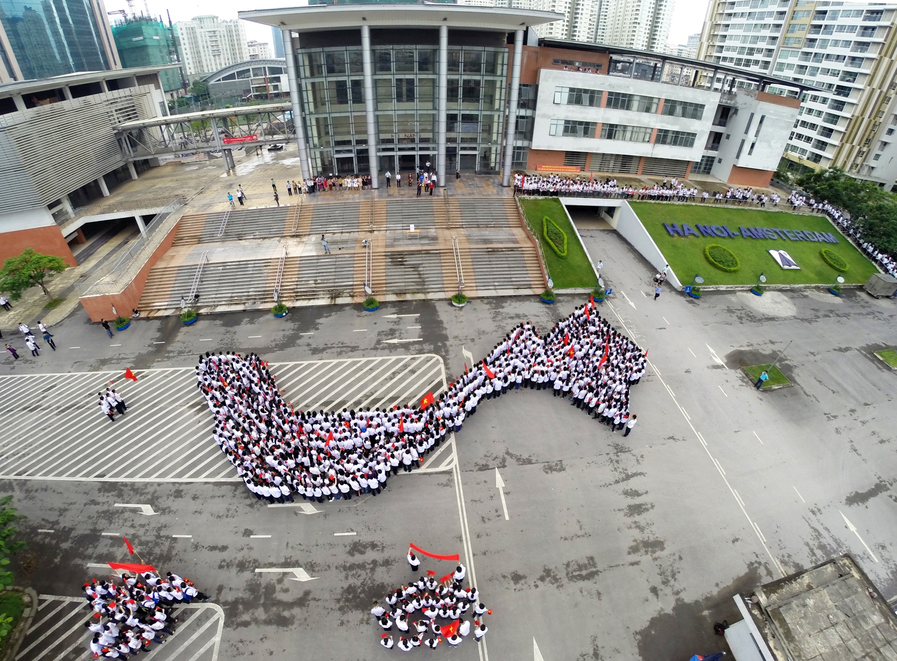 | Sáng 19/5, trường THPT Amsterdam Hà Nội đã tổ chức lễ bế giảng năm học 2013-2014 với những hoạt động ý nghĩa. 7h30, toàn bộ học sinh khối cấp 3 của trường đã xếp hình bản đồ Việt Nam để chuẩn bị cho nghi lễ chào cờ.
