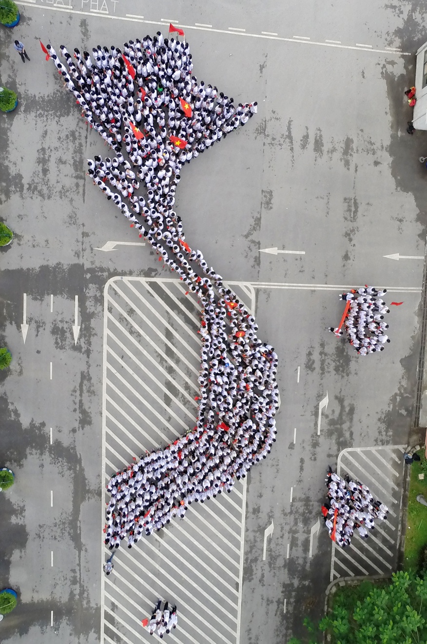 | Bản đồ Việt Nam với hình ảnh quần đảo Hoàng Sa, Trường Sa, Côn Đảo đã thể hiện rõ chủ quyền biển đảo của Việt Nam trước sau như một và không hề thay đổi. 1.600/2.000 học sinh của trường đã tham gia xếp hình bản đồ.
