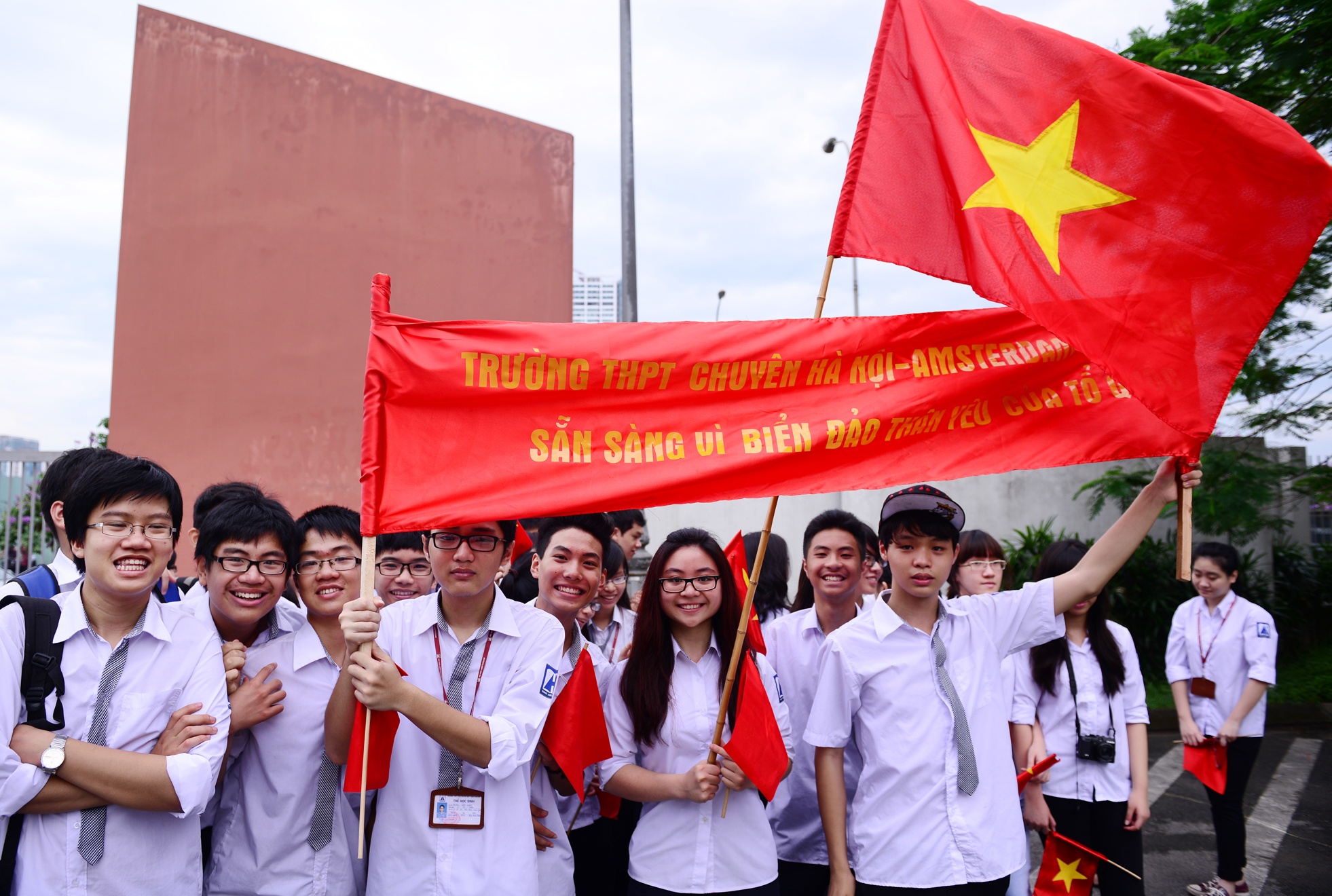 | Băng rôn thể hiện sự quyết tâm, tinh thần yêu nước, hết mình vì Tổ quốc của học sinh. Trong bài phát biểu, hiệu trưởng Lê Thị Oanh nêu rõ: "Trường THPT Hà Nội Amsterdam bày tỏ sự nhất trí cao với quan điểm của nhà nước, ủng hộ mạnh mẽ lực lượng Cảnh sát biển, lực lượng kiểm ngư và ngư dân trong sự nghiệp bảo vệ chủ quyền lãnh thổ thiêng liêng của Tổ quốc".