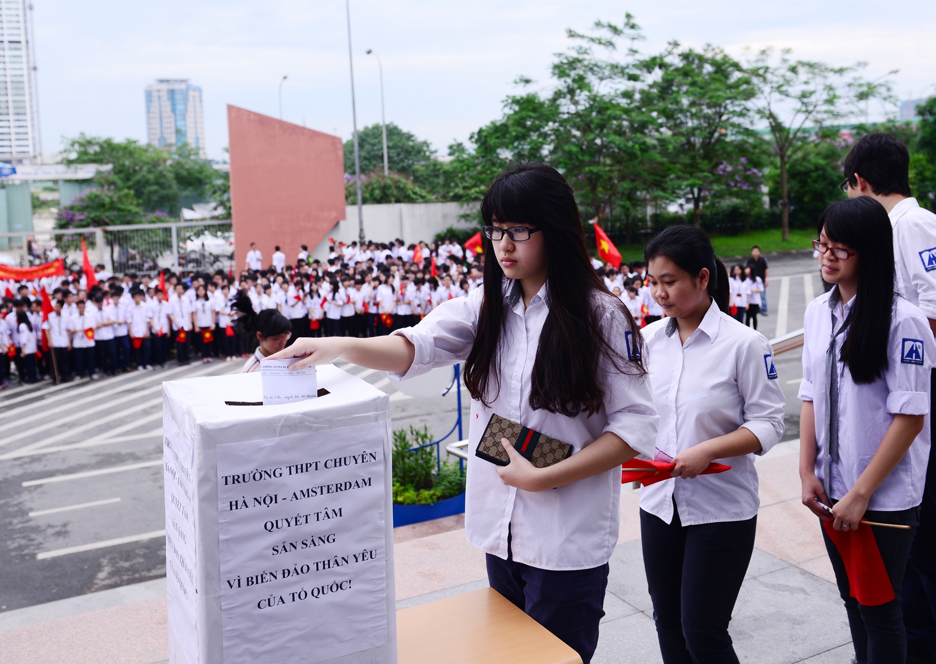 | Sau khi kết thúc lễ chào cờ, thầy và trò trường đã tham gia góp một phần nhỏ bé để tặng các chiến sĩ đang bảo vệ chủ quyền biển đảo quê hương. Là ngôi trường có lịch sử ra đời từ khát vọng hòa bình, từ tình đoàn kết quốc tế, trường Hà Nội - Amsterdam muốn gửi "Thông điệp hòa bình" tới toàn thể giới giáo chức, học sinh, sinh viên và nhân dân các nước, các tổ chức cá nhân, các lực lượng yêu chuộng hòa bình trên thế giới hãy tích cực ủng hộ Việt Nam.