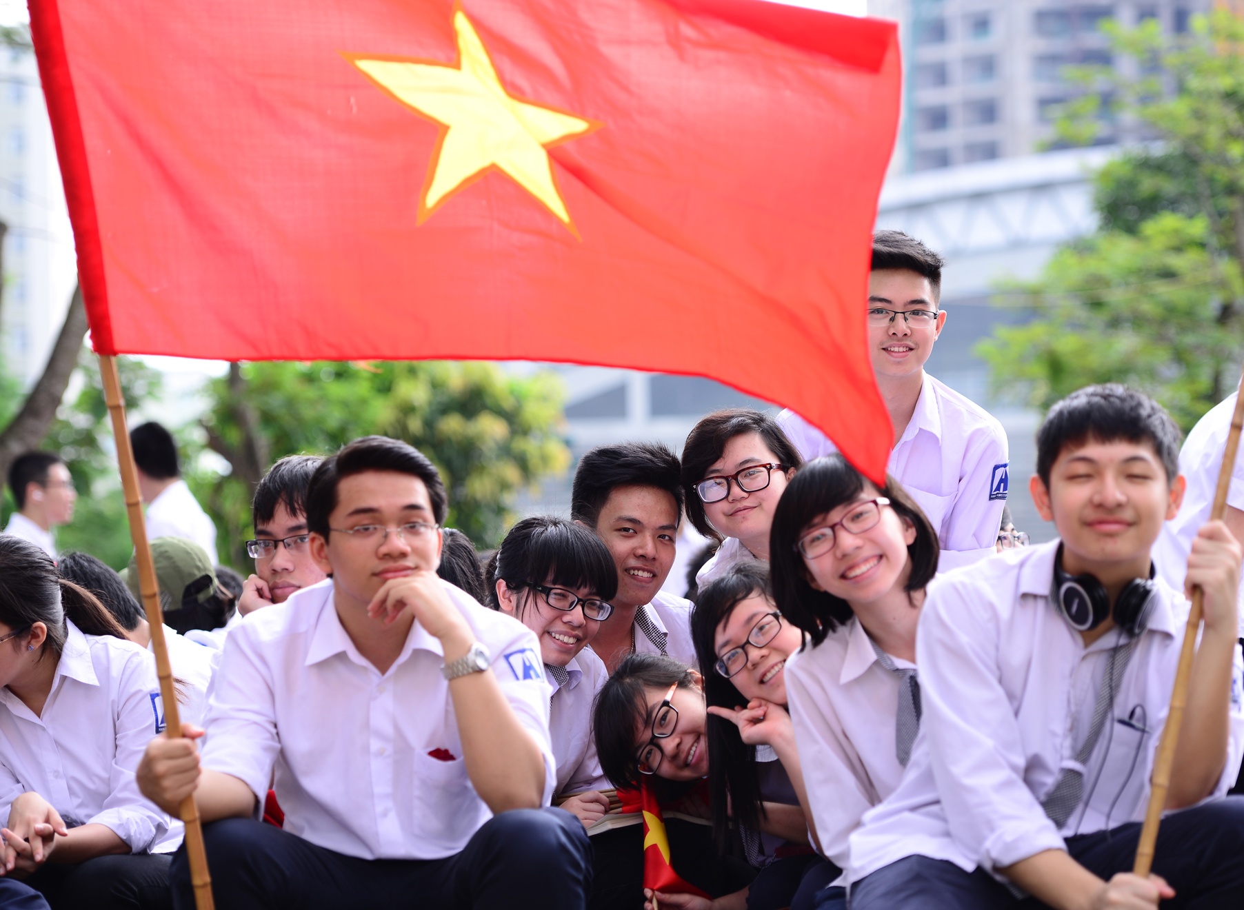 | Toàn bộ học sinh trường Amsterdam đã dâng cao lá Quốc kỳ, cùng hô vang "Tổ quốc Việt Nam muôn năm, muôn năm, muôn năm".