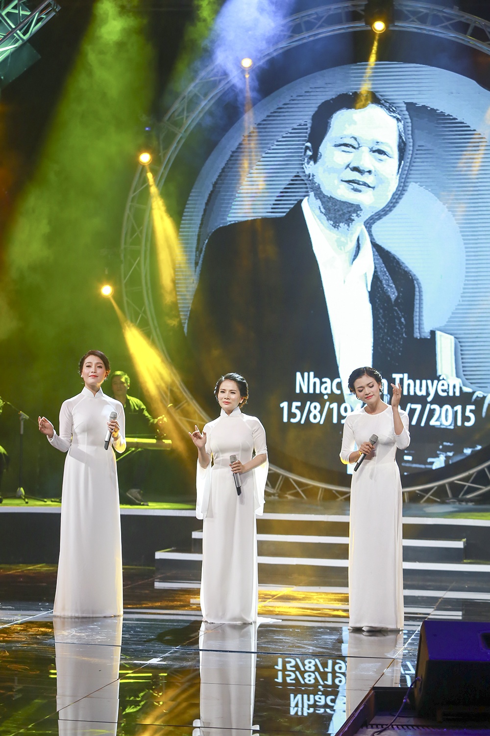 | Ba ca sĩ Phương Thảo, Thành Lê, Huyền Trang thể hiện ca khúc Ca dao em và tôi để tưởng nhớ nhạc sĩ An Thuyên - người mới qua đời cách đây không lâu. |