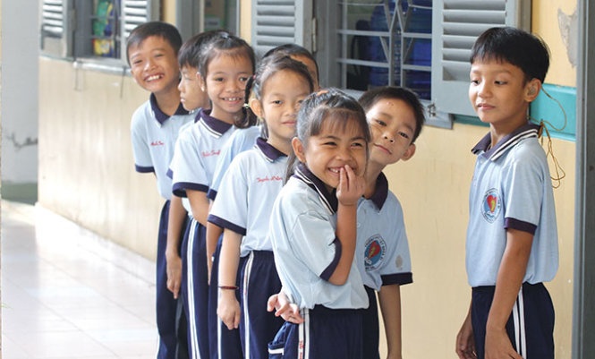 | Các em lớp dự bị cũng háo hức chờ đợi tham dự buổi chào cờ đầu tuần, dù chỉ mới làm quen với bài Quốc ca bằng ngôn ngữ của riêng mình. |