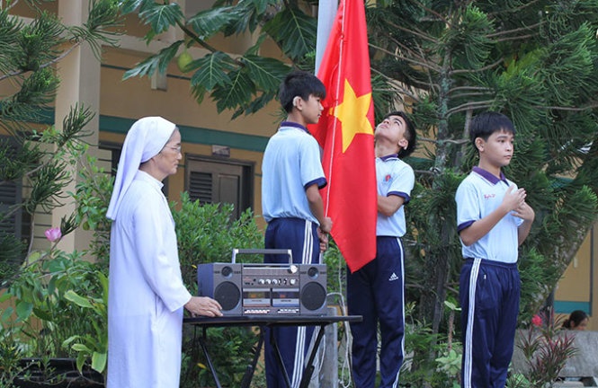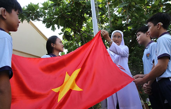| Soeur Nguyễn Thị Sương, Hiệu trưởng trường khuyết tật Nhân Ái, hướng dẫn học trò khiếm thính cách treo cờ sao cho đúng. |