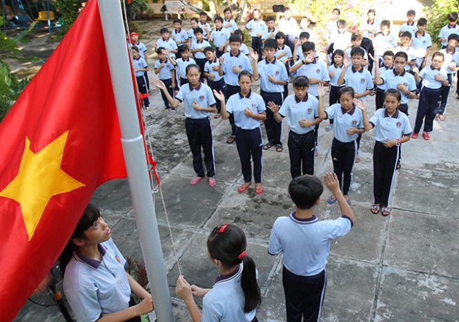 Các em được chuẩn bị cho buổi chào cờ ngày 31/8 vì hôm đó trường sẽ làm lễ kỷ niệm 70 năm Quốc khánh nước Cộng hòa xã hội chủ nghĩa Việt Nam và lễ khai giảng năm học mới 2015-2016.
