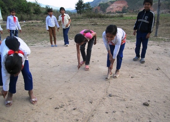 | Hết lượt chơi các em kẻ lại ô cho rõ nét vì sân thường mờ đi do những lượt thi đấu. |