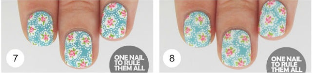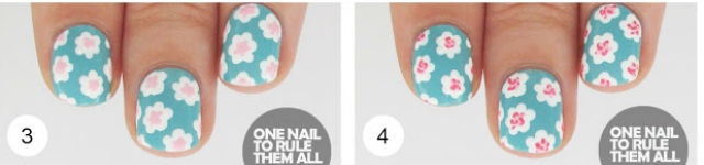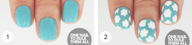 Kiểu nail đơn giản đầu tiên bạn có thể tự vẽ cho chính mình là "hoa nhí". Bạn cần đánh một lớp màu sơn nền thật như ý. Ngoài màu xanh như hình gợi ý, bạn hoàn toàn có thể thử nghiệm với những gam màu tươi mới khác. Miễn là việc phối màu giữa nền và hoa phải thật "ăn ý". Sau khi lớp sơn nền khô, bạn dùng bút vẽ khéo léo vẽ những bông hoa nhỏ xinh 5 - 6 cánh như hình.