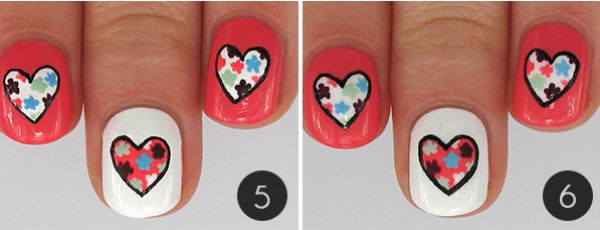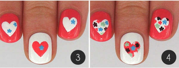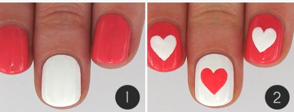 Kiểu móng tay thứ 3 này sẽ hoàn toàn chinh phục những cô nàng đang yêu. Những gì bạn cần là các màu sơn móng tay và băng dính. Đầu tiên, hãy gấp đôi một mẩu băng dính lại, cắt theo hình cánh cung để tạo thành khuôn hình trái tim. Sau khi lớp sơn nền khô, bạn dán mẩu băng dính có "lỗ" hình trái tim lên móng và sơn đè phần màu khác lên. Việc này sẽ giúp bạn có được hình trái tim lên móng một cách dễ dàng.