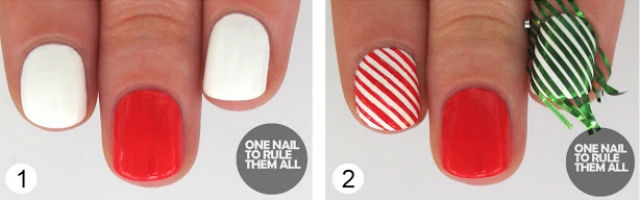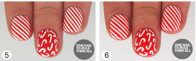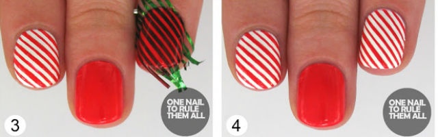 Vẫn là tông màu đỏ trắng cực nổi bật như trên, song kiểu nail thứ 4 này lại đặc biệt dành riêng cho những cô nàng vụng về. Thứ bạn không thể thiếu để có được kiểu nail này chính là băng dính nhỏ. Sau khi lớp sơn nền khô, bạn lần lượt dán băng dính lên móng như hình. Khoảng cách giữa những sợi băng dính càng đều, càng nhỏ, tạo hình thu được càng ấn tượng và vui mắt.