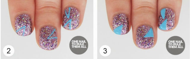 Tiếp đó, bạn sơn đè màu sơn thứ hai lên. Chờ sơn khô và tháo băng dính. Thành quả bạn nhận được sẽ là bộ nail bên tay phải.