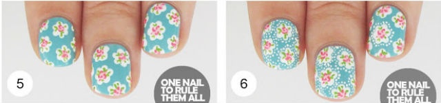 Việc cuối cùng là dùng bút vẽ những dấu chấm bi nhỏ bên ngoài bông hoa và bạn sẽ có một bộ móng tay kiểu "hoa nhí" vô cùng xinh xắn và vui mắt để du xuân.