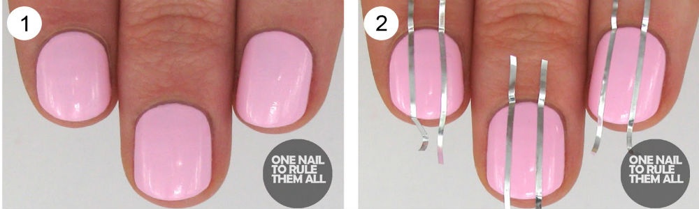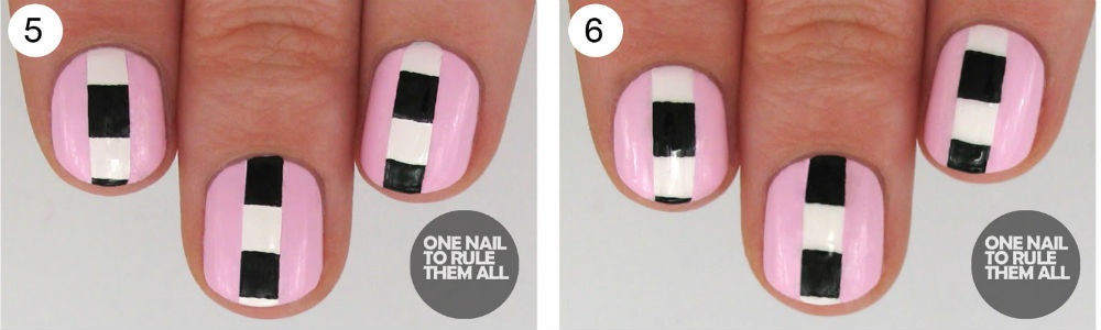 Nếu như không tự tin bản thân có thể thành công với kiểu nail kể trên, bạn có thể bắt tay thực hiện kiểu móng thứ hai này. Đơn giản, dễ thực hiện nhưng ấn tượng là những gì mà nó đem lại cho bạn. Chuẩn bị 3 tông màu: hồng, đen, trắng và băng dính nhỏ là đủ.
