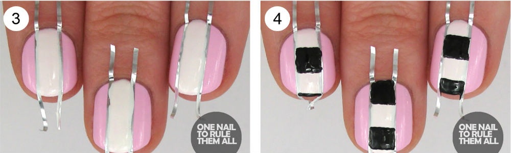 Đầu tiên, đánh một lớp sơn nền màu hồng. Chờ khô rồi dùng 2 mảnh băng dính nhỏ như hình chia móng tay thành 3 phần cân nhau. Tiếp đó, sơn kín màu trắng vào phần giữa móng. Rồi chờ sơn khô để vẽ thêm màu đen ngăn cách.