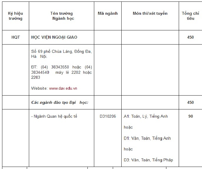 Trong số thí sinh trúng tuyển, Học viện xét 125 sinh viên có nguyện vọng học hệ đào tạo chất lượng cao các ngành: Quan hệ quốc tế, Luật quốc tế, Kinh tế quốc tế, Truyền thông quốc tế và Ngôn ngữ Anh.