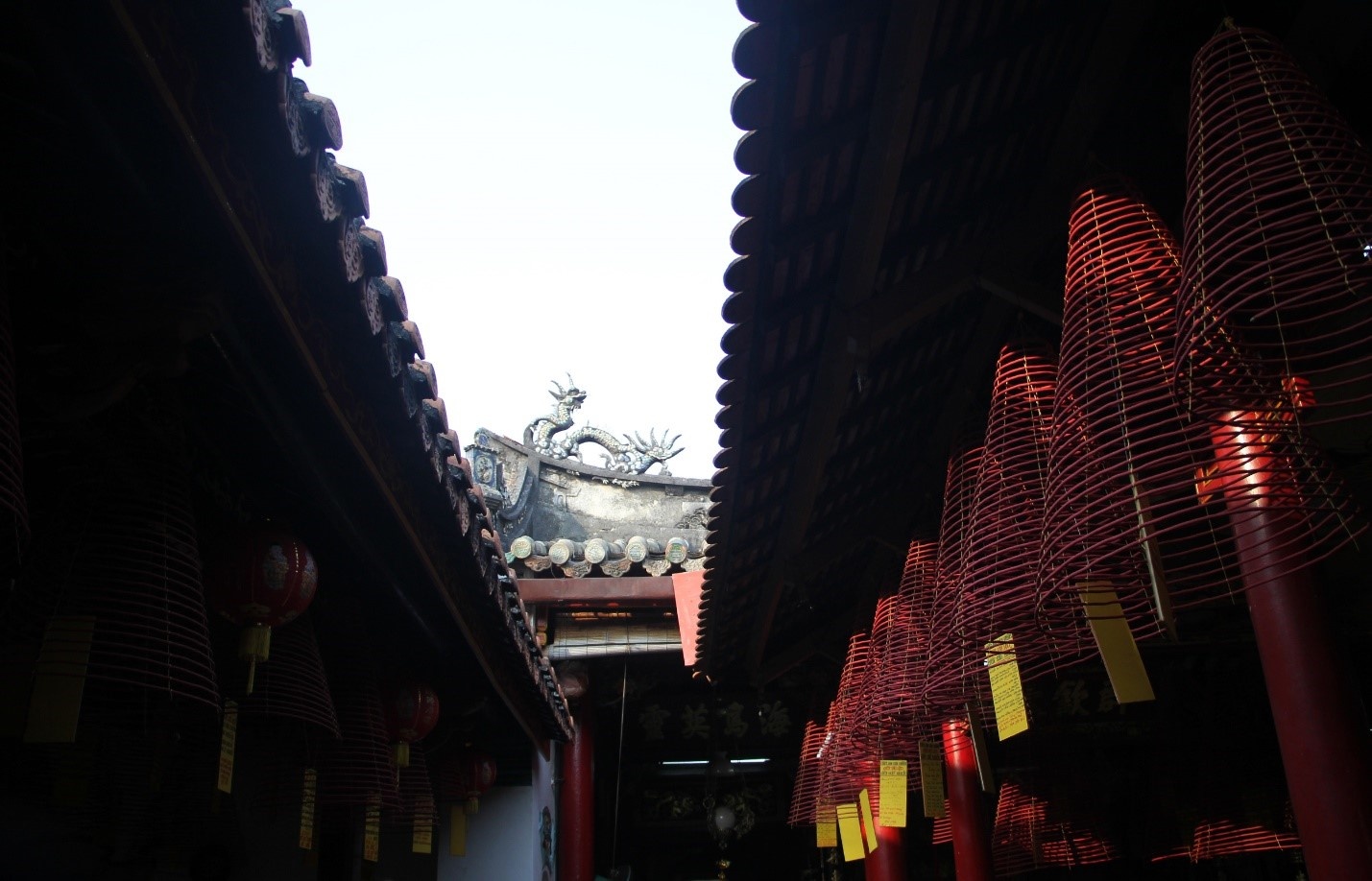 Chùa Cầu, dãy nhà cổ hai tầng quay lưng phía bến sông Hoài, Hội quán Quảng Ðông, Phúc Kiến... trầm mặc đứng đó như để cân bằng với vẻ tấp nập của dòng người qua lại trên phố. |