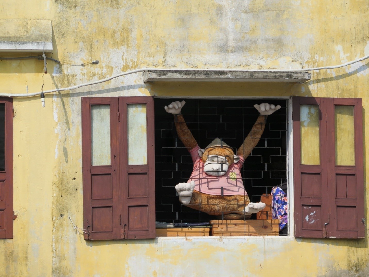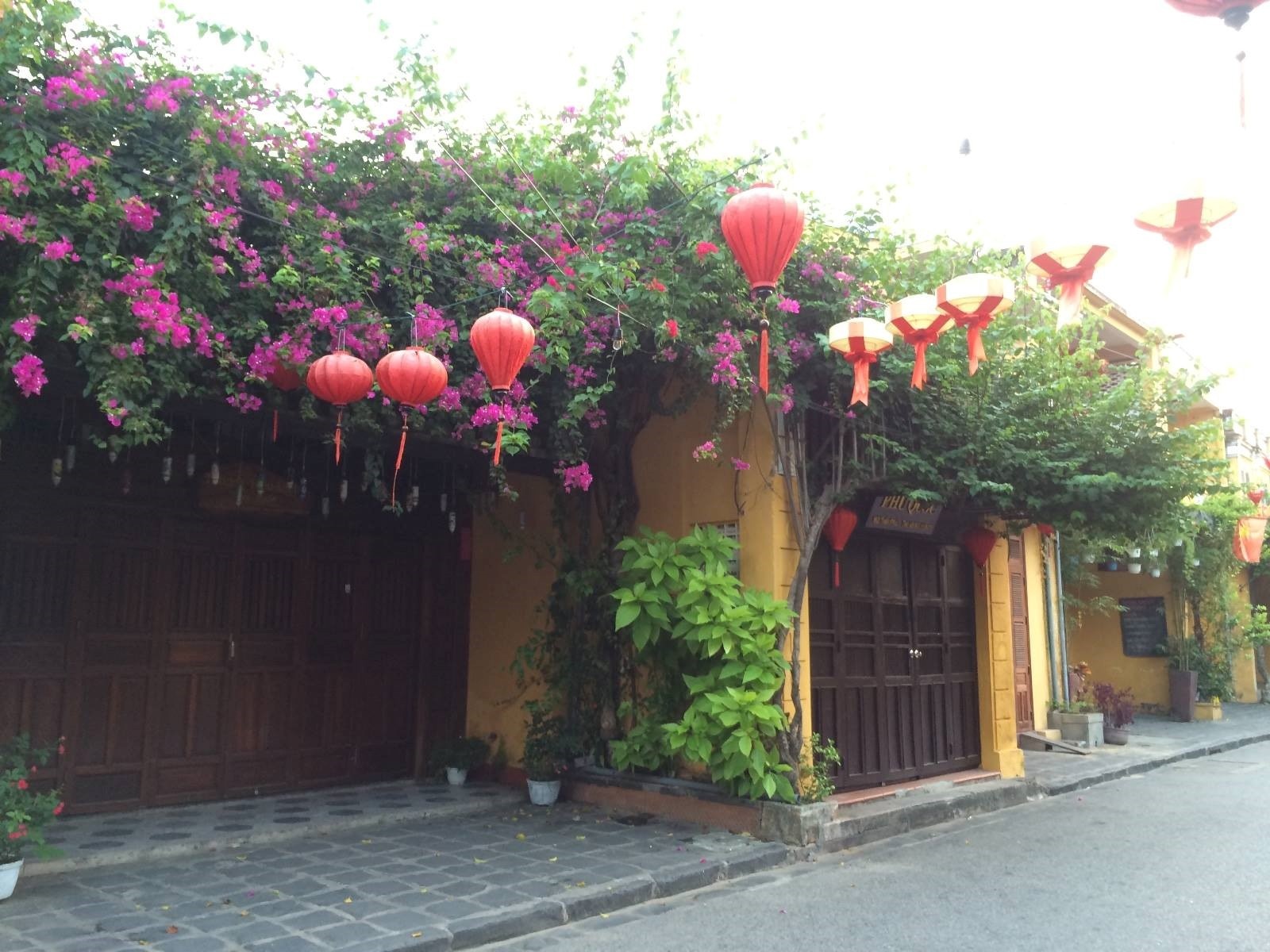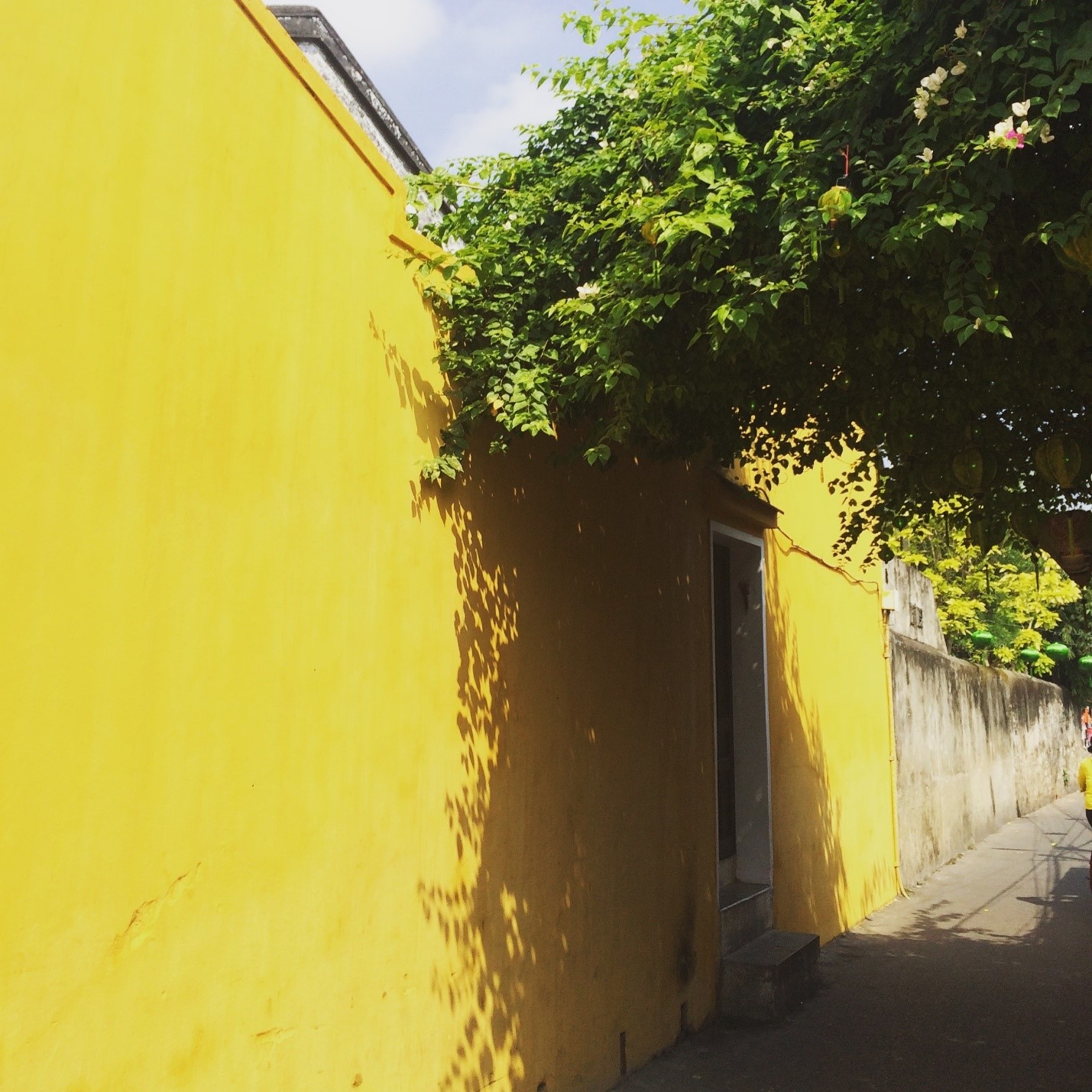 Nhớ về Hội An là nhớ những mảng tường vàng từ phố này qua phố khác. Khi đặt cạnh đó một khóm hoa giấy, tường là cái nền tuyệt vời của một bức tranh. Khi đặt lên đó một khung cửa gỗ nâu, ta biết ở đằng sau đó, đời sống êm đềm đã nối nhau hàng thế kỷ. |
