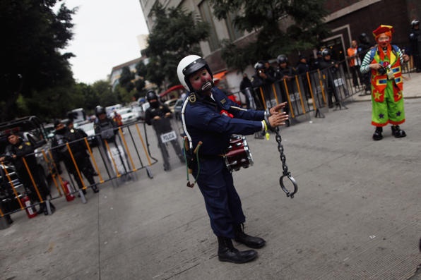 | Một người cải trang thành cảnh sát với chiếc còng to tướng. Anh đứng ngay trước hàng rào cảnh sát. Ảnh: Reuters. |