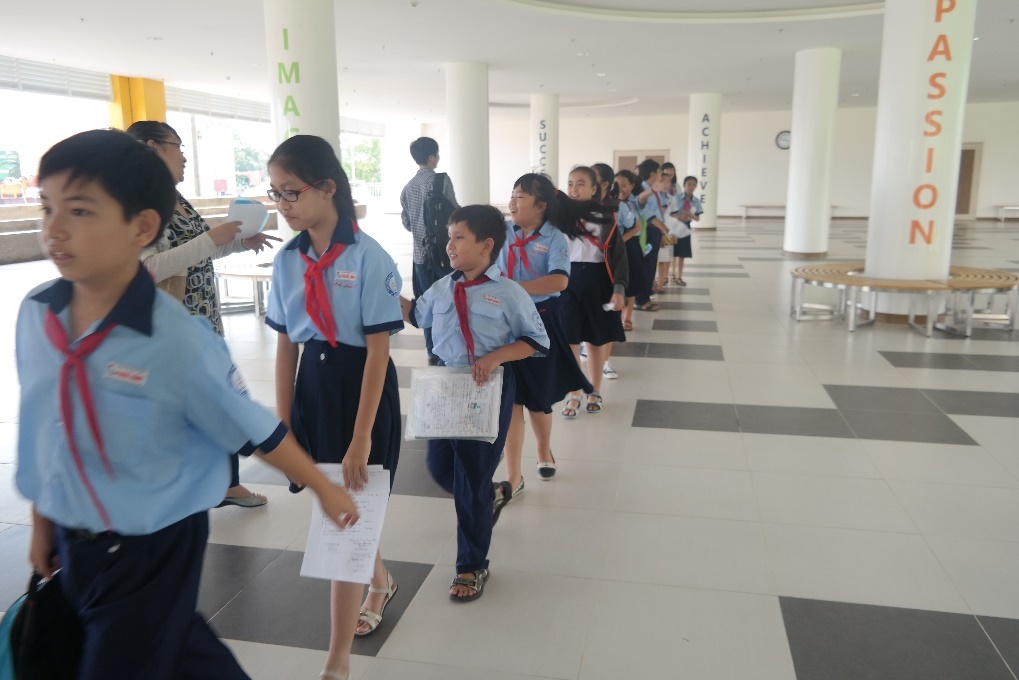 | Các em học sinh vào phòng thi tại cụm thi Wellspring Saigon. |