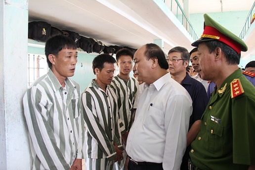| Phó Thủ tướng Nguyễn Xuân Phúc động viên một phạm nhân tại trại giam Ninh Khánh được đề nghị đặc xá năm 2013. Ảnh: Cổng thông tin điện tử Bộ công an. |