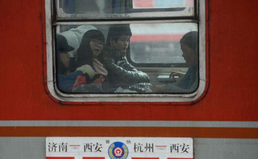 | Hành khách trên đoàn tàu đang chạy về thành phố Tây An, tỉnh Thiểm Tây, Trung Quốc. Những người con dù công tác ở xa nhưng vẫn cố gắng trở về nhà đón Tết cùng gia đình. Ảnh: Tân Hoa xã. |