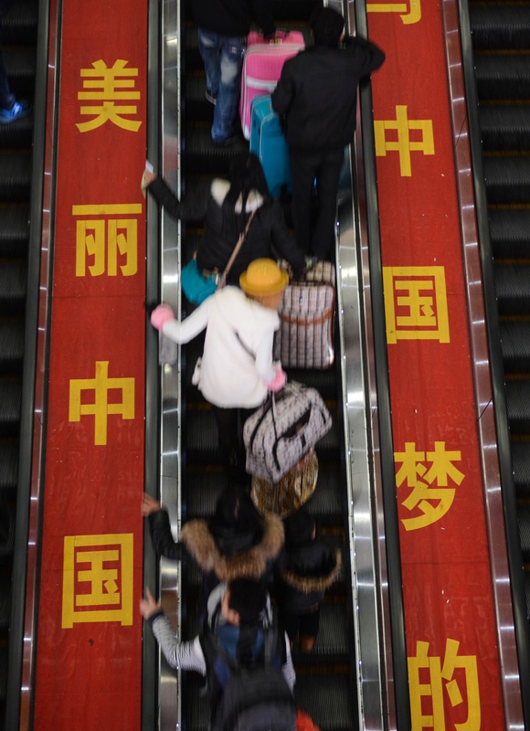 | Hành khách trên thang máy chuẩn bị đón tàu về quê tại nhà ga Hàng Châu ở tỉnh Chiết Giang ngày 7/1 khi Tết âm lịch đang tới gần. Vào thời điểm trước Tết, nhiều kẻ gian lợi dụng tình trạng sốt vé để thu lợi bất chính. Ngày 13/1, cảnh sát đường sắt thành phố Vũ Hán, Trung Quốc tịch thu hơn một triệu vé tàu giả và bắt 8 nghi phạm liên quan. Một trong những nghi phạm đó là Zhou. Tên này đã bán 18.325 vé tàu giả trên mạng kể từ năm 2011. Ảnh: Tân Hoa xã. |