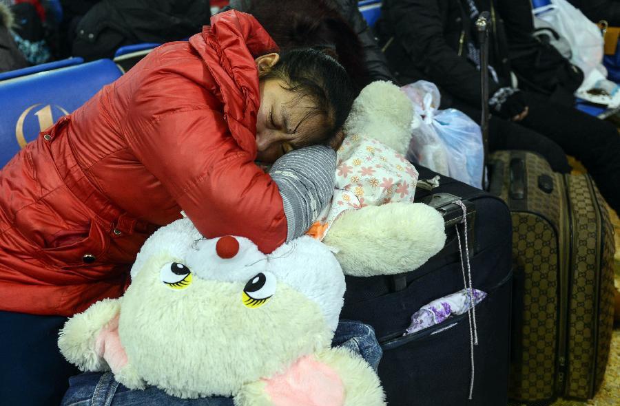 | Người phụ nữ tranh thủ ngủ khi đang đợi tàu tại nhà ga Hàng Châu, tỉnh Chiết Giang. Theo tổng công ty đường sắt Trung Quốc, khoảng 257 triệu người nước này sẽ di chuyển bằng tàu vào dịp trước Tết nguyên đán. Ảnh: Tân Hoa xã. |